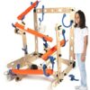 Rube Goldberg in action, children can use the balls made of assorted materials and sizes included with the add-on kit, or with marbles, wheels, water, etc